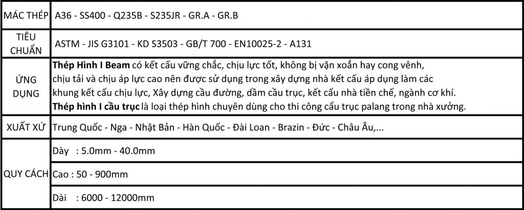 Thép I Cánh Côn tiêu chuẩn JIS / ASTM / GOST/ EN. + Xuất xứ : Mỹ , Nhật ,Nga, Trung Quốc, Hàn Quốc, Thailand +Tiêu chuẩn : SS400, JIS G3101