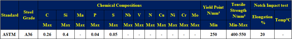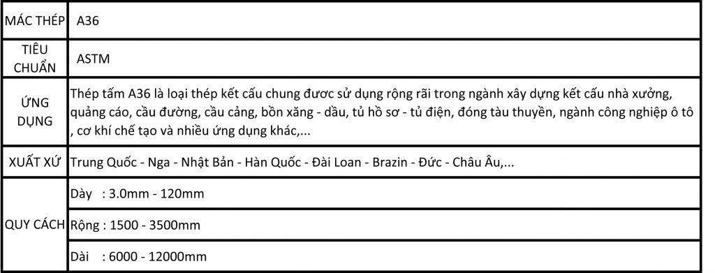Sản phẩm thép A36 luôn được đánh giá cao về chất lượng là thép tấm cán nóng, thép tấm kết cấu chung phổ biến nhất được sản xuất theo tiêu chuẩn ASTM của Mỹ. thép A36 là thép cacbon và thép hợp kim thấp. Mỗi nước có sản phẩm tương đương nhưng yêu cầu theo sức căng bề mặt (độ giãn chảy) nhỏ nhất là 400Mpa và tuân thủ theo thành phần hóa học.