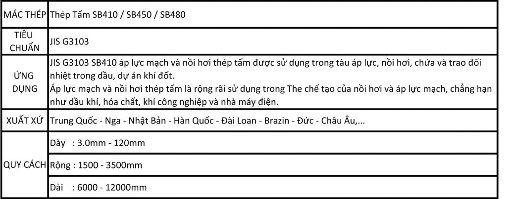 Thép Tấm SB410 / SB450 / SB480 – JIS G3103 là sản phẩm thép tấm được cán nóng, thuộc nhóm thép carbon và thép hợp kim molypden cho nồi hơi và bình áp lực được sản xuất theo Tiêu chuẩn Nhật Bản JIS G3103.